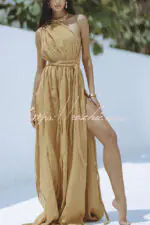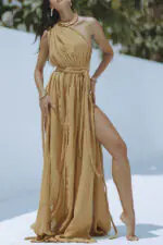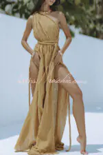 Avani Linen Blend Draped Braids One Shoulder Slit Cover Up Maxi Dress