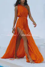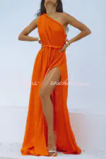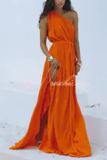 - This Maxi Dress is reimagined with ornate braided detailing. elevating its one-shoulder design to a realm of sophisticated artistry. Fashioned from cotton gauze in a vivid orange. it boasts a sensual thigh-high slit. accented with intricate braiding that traces the dress’s flowing contours. This maxi. with its bohemian elegance. invites the warmth of summer soirees and balmy sunset strolls. A true emblem of chic. it promises to be the centerpiece of any high-end wardrobe.