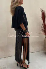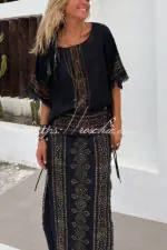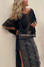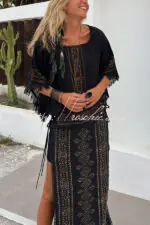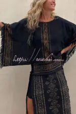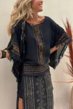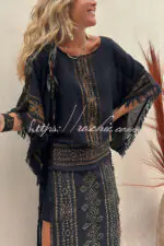 Bianca Linen Blend Ethnic Print Tassel Trim Wide Sleeve Loose Top