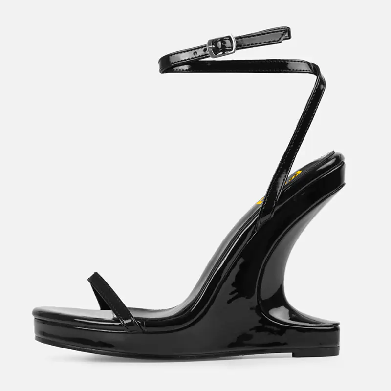 Black Patent Leather Platform Heels Sexy Ankle Strap Wedge Sandals