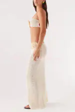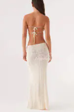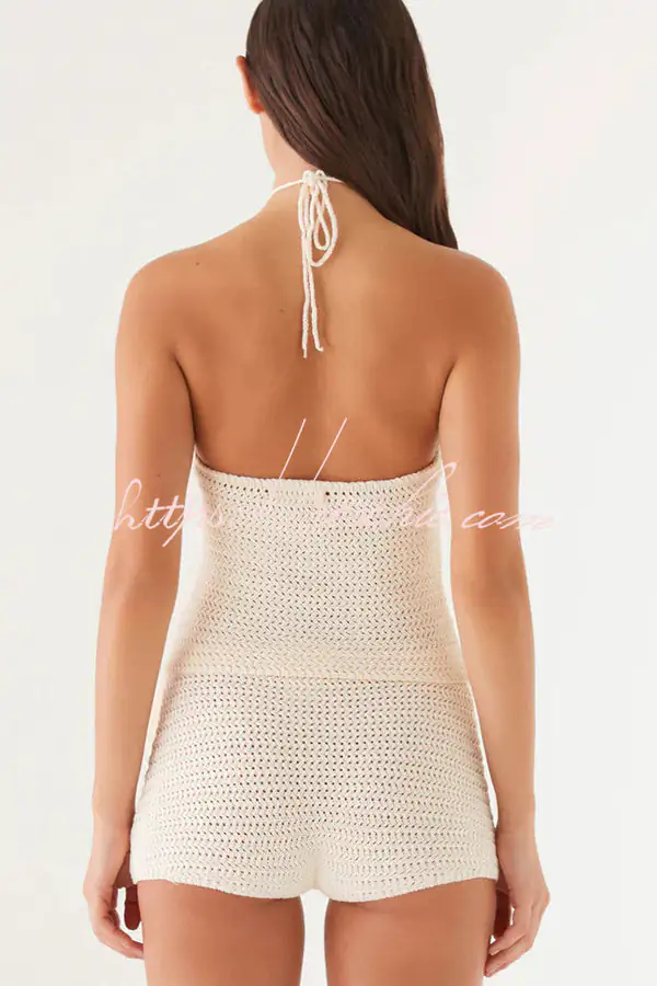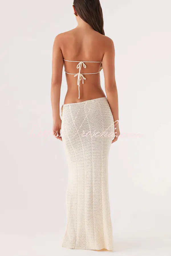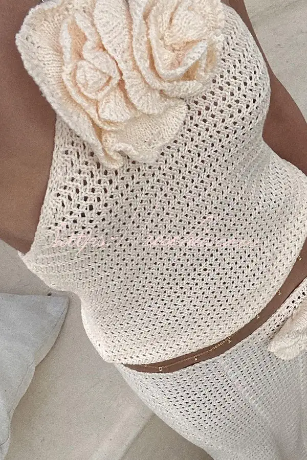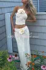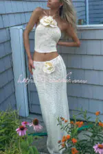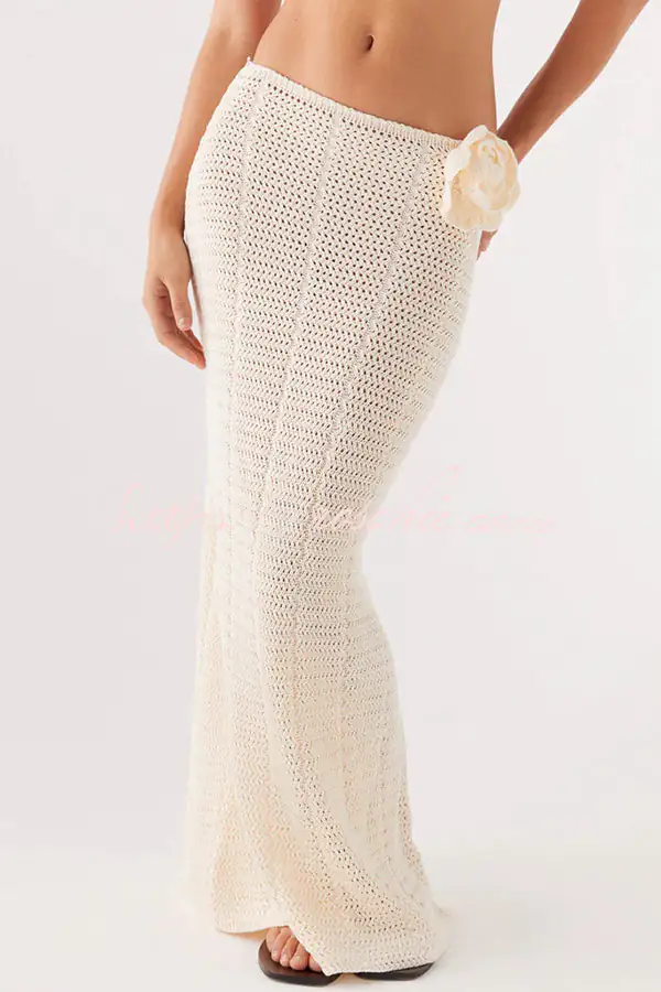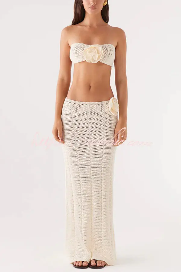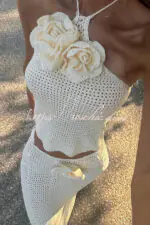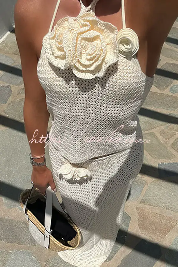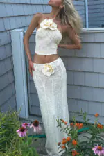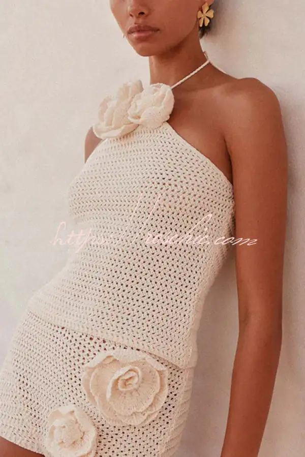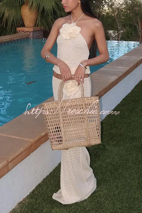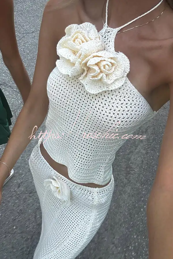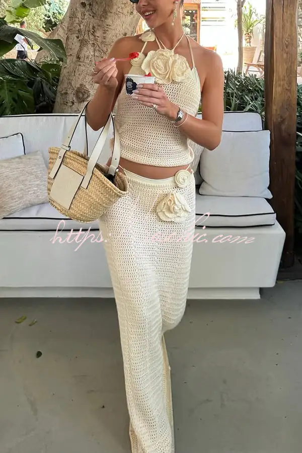 Blooming Sexy Knit Floral Halter Top and Stretch Crochet Maxi Skirt Cover-up Set
