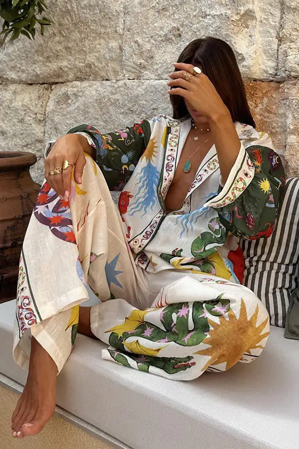 Bohemian Beauty Unique Print Long Sleeve Loose Shirt and Elastic Waist Pants Set