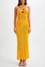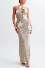 - This charming piece exudes femininity and elegance. The functional halter neck design adds a touch of glamor and allows for custom styling. while delicate crochet floral appliqués add a romantic and whimsical feel to the dress. The fishtail hem shape adds drama and elegance. creating a stunning silhouette that’s sure to turn heads. Perfect for special occasions or to enhance your everyday look.