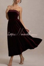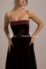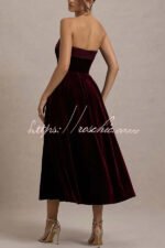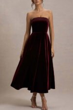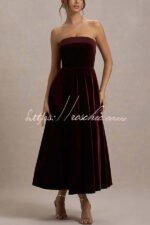 - Known for its rich texture and timeless elegance. this strapless midi dress is a sophisticated choice for your next special occasion. Wrapped in premium port velvet. the fitted silhouette flatters your silhouette. Subtle satin details add a touch of sophistication and enhance the overall look. Minimal accessories and classic heels exude effortless elegance and style. perfect for an evening party or formal dinner.