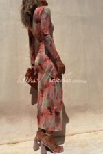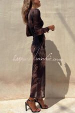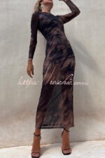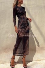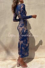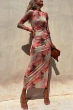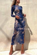 Charm Lady Mesh Overlay Tie Dye Print Long Sleeve Ruched Stretch Midi Dress