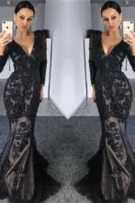 Charming Black Tulle Nude Lining Evening Dresses with Sleeves Elegant Long Sleeves Beads Appliques Prom Dresses