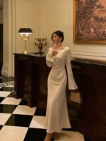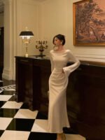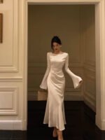 Chic Mermaid Boat Neckline Long Sleeves Silk Satin Prom Dresses Birthday Dress SD300