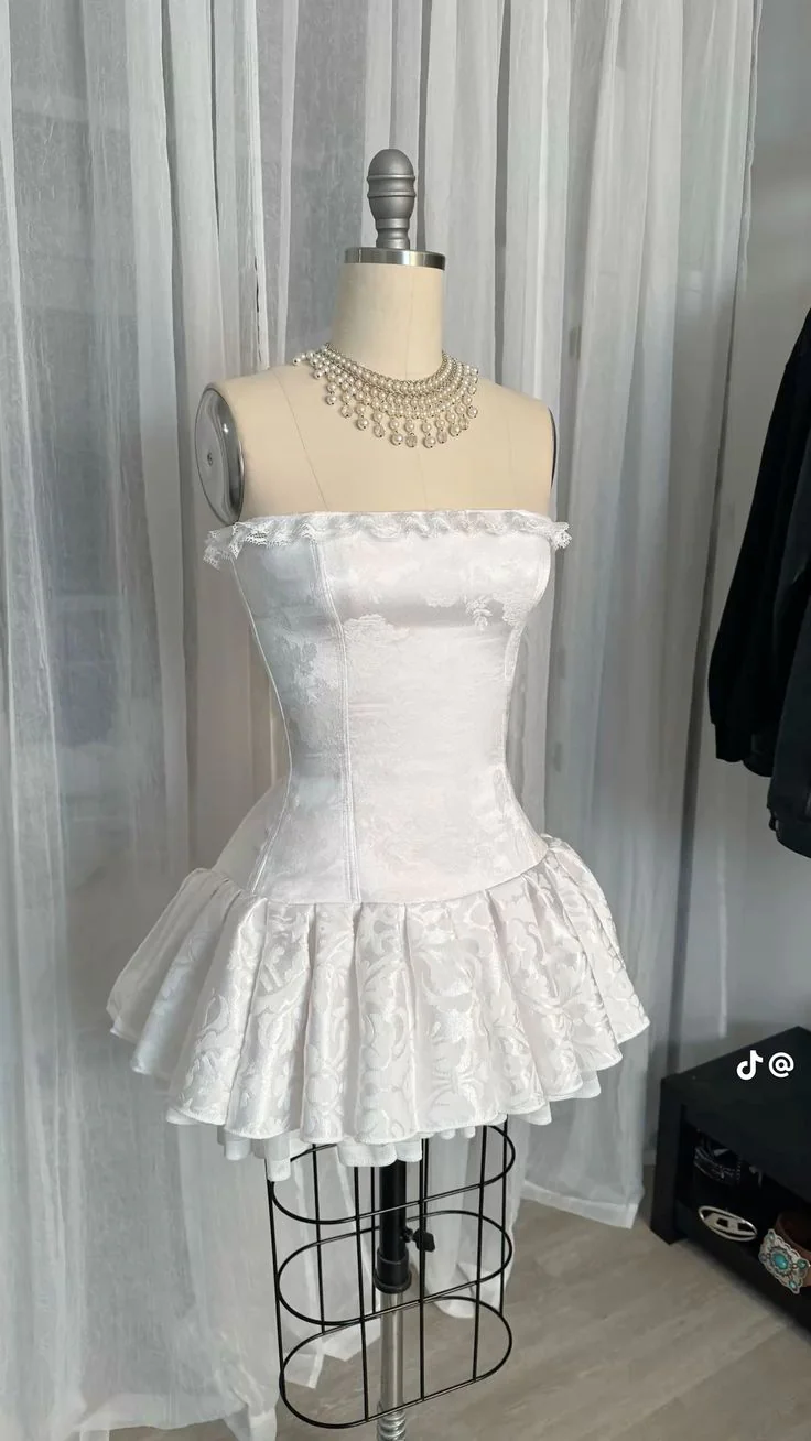 Chic Satin Print Floral A Line Homecoming Dress White Strapless Birthday Dress S229