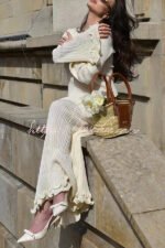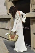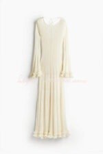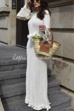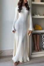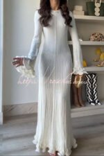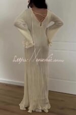 Clara Pleated Fabric Wavy Edges Bell Sleeve Tie-back Stretch Maxi Dress