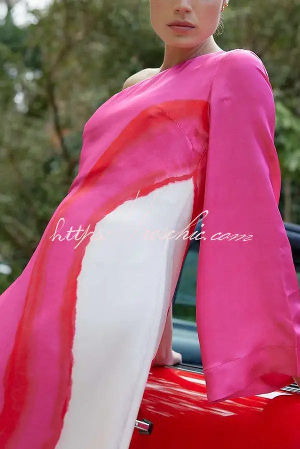 Contrast Print Elegant One-sleeve Slit Maxi Dress