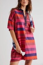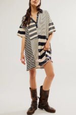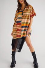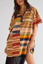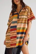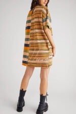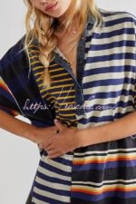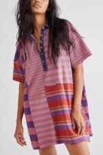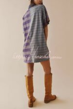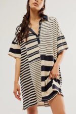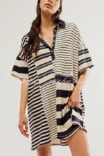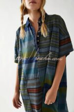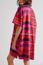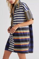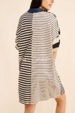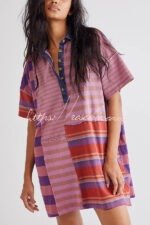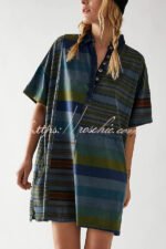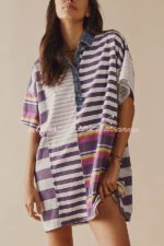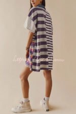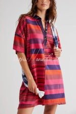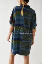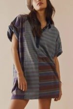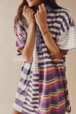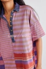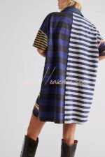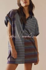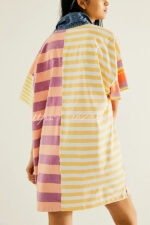 Contrast Striped Patchwork Denim Lapel Loose Casual Mini Dress