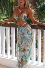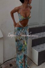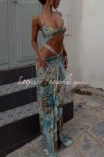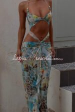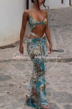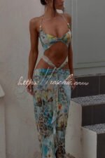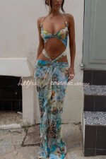 Dreaming Body Mesh Printed Beaded Strap Cutout Twist Waist Stretch Maxi Dress