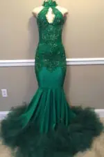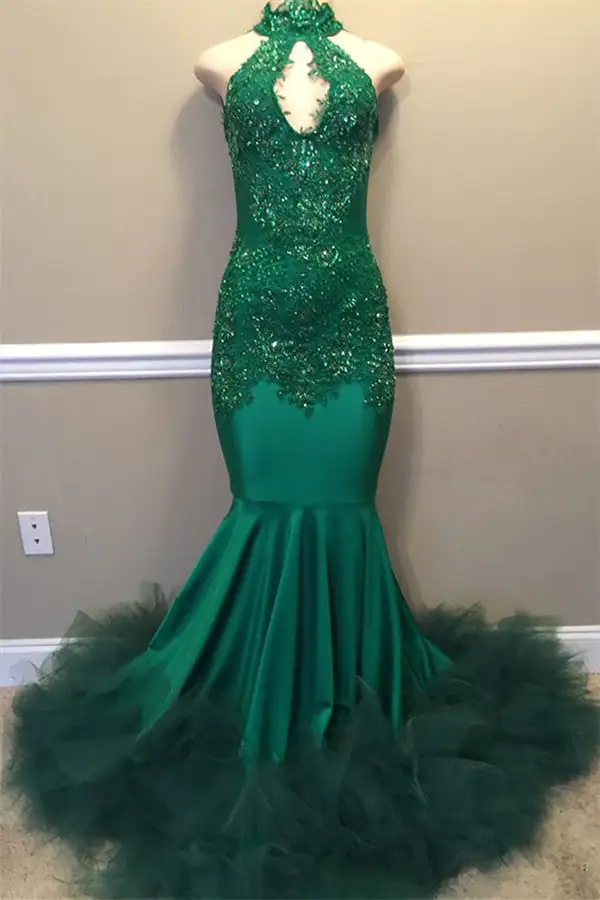 Elegant Beads Appliques Halter Prom Dresses Fit and Flare Sleeveless Tulle Evening Gowns