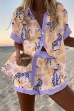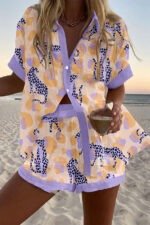 Elegant Snow Leopard Print Loose Button Elastic Waist Shorts Set