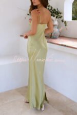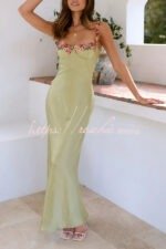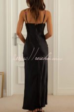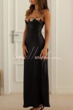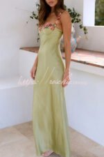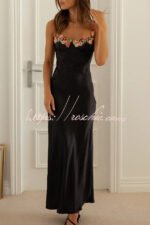Endless Love Satin Embroidered Flower Trim Strap Maxi Dress