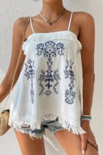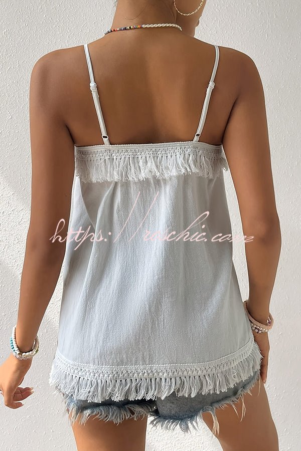 Ethnic Embroidered Adjustable Straps Fringed Top