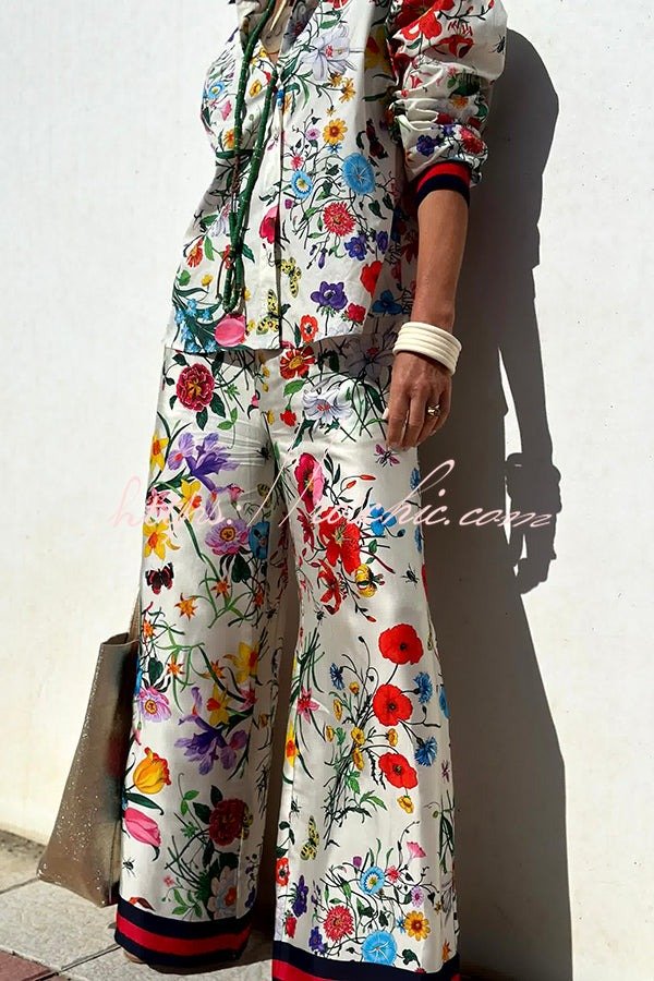 Fabulous Fiesta Satin Floral Unique Print Elastic Waist Pocketed Wide Leg Pants