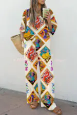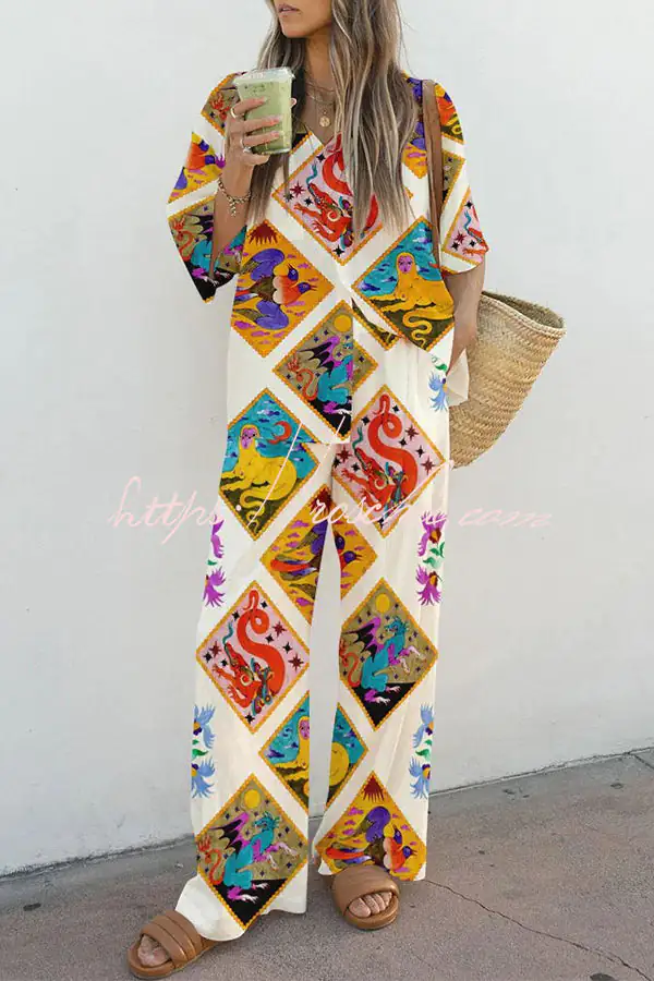Fantasy World of Mythical Beasts Printed Button Pocket Elastic Waist Pants Suit