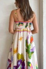 Feel Effortlessly Linen Blend Unique Print Smocked Back Pocketed Midi Dress
