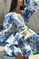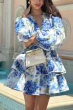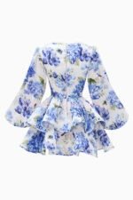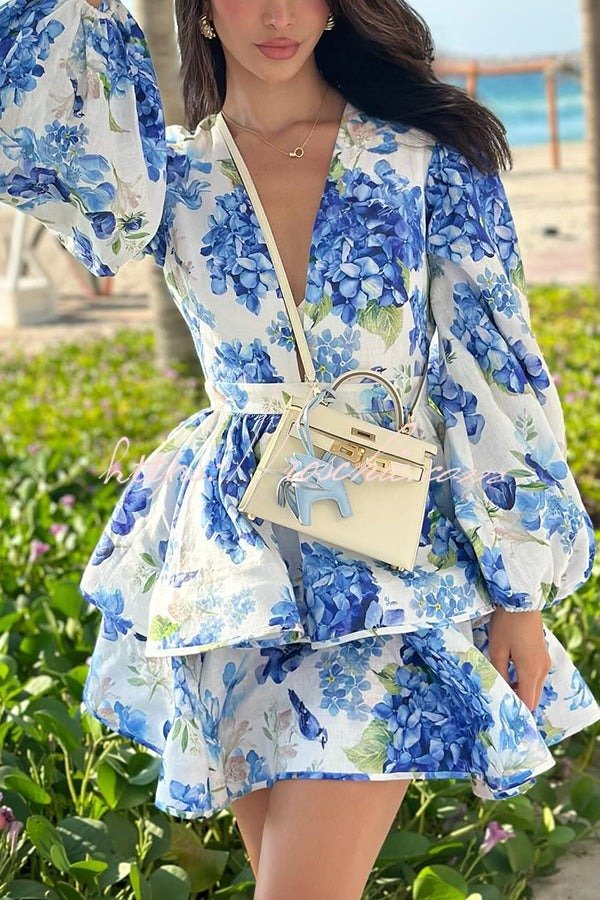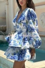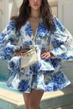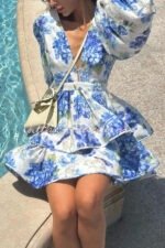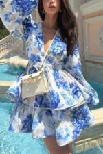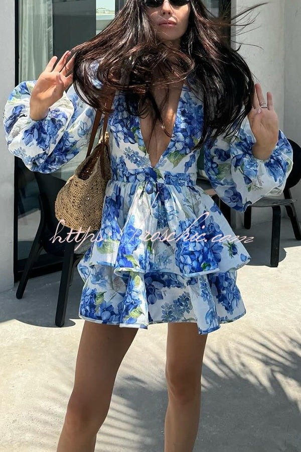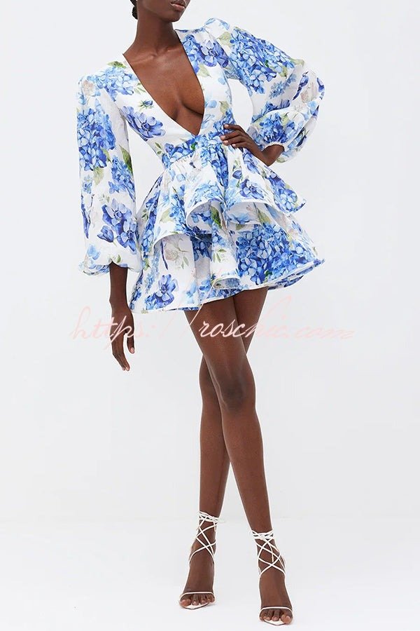 Feminine and Sexy Floral Print Deep V-neck Balloon Sleeve Tiered Mini Dress