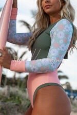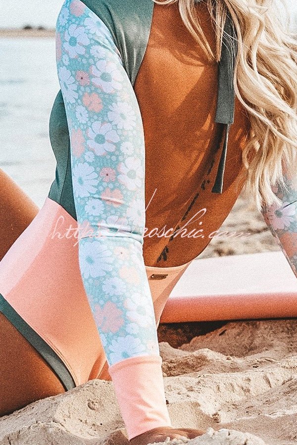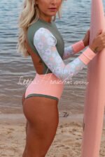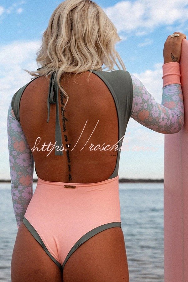 Floral Print Paneled Long-sleeved Open Back Stretch One-piece Swimsuit