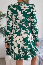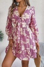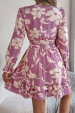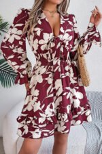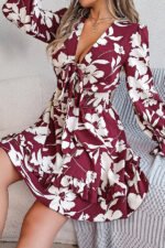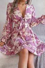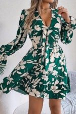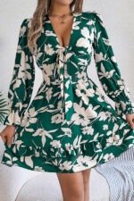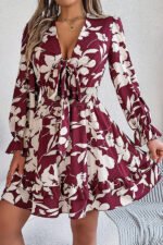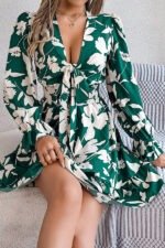 Floral Print V-neck Lace-up Long-sleeve Elastic Waist Mini Dress