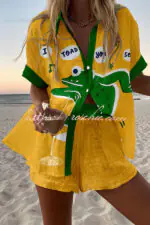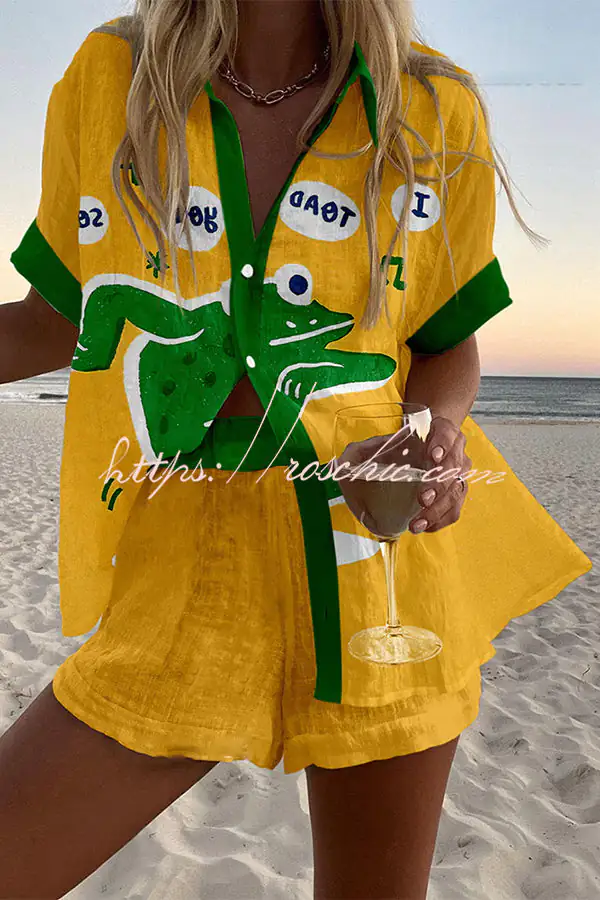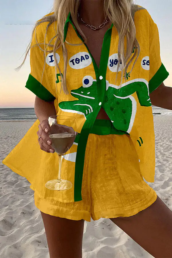 Frog Print Loose Button Elastic Waist Shorts Set