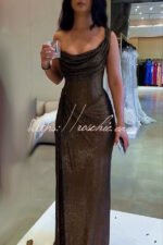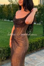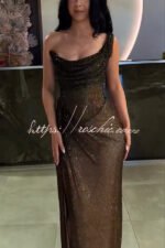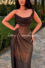 Glitzy Gala Glitter Fabric One Shoulder Ruched Slit Maxi Dress