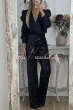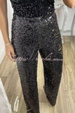 Glitzy Glamour Sequin High Rise Elastic Waist Wide Leg Pants