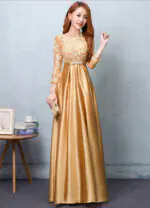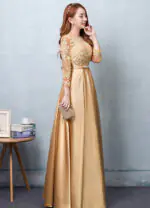Gorgeous Gold Evening Dress Satin evening dress Lace Applique Wedding Guest Dresses Sash A Line Maxi Mother’s Dress wedding guest dress