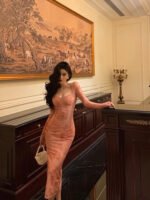 Gorgeous Sheath Square Neckline Long Sleeves Pink Lace Date Night Dress Long Prom Dresses Birthday Outfits SD1122