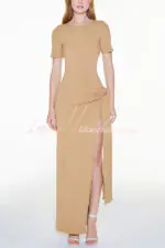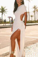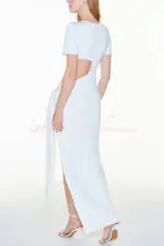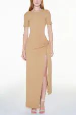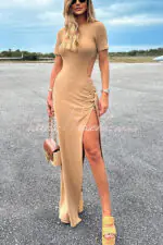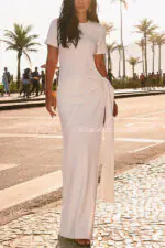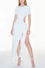 - This dress is made from exclusive ribbed knit fabric. Dress with a fitted fit. long length. round neckline. short sleeves. cutout at the waist. slit on the left side. fixed belt detail with belt loops to tie at hip height.