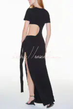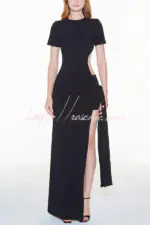 Holiday Party Ribbed Knit Cutout Waist Straps Slit Maxi Dress