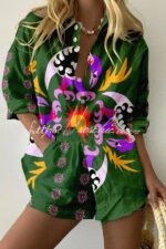 Take Me To The Ocean Satin Unique Print Long Sleeve Shirt and Elastic Waist Pocketed Pants Set