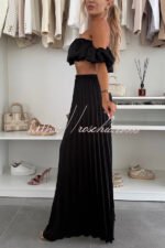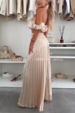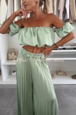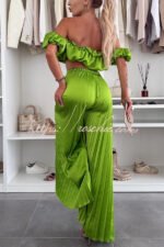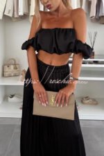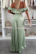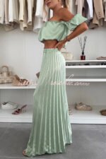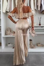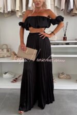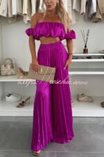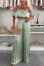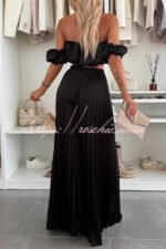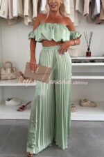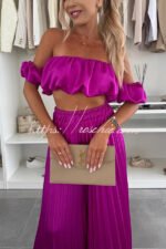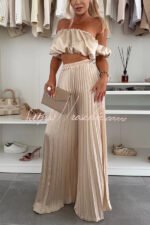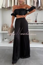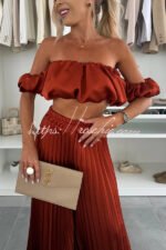 Jorie Satin Off Shoulder Puff Sleeve Crop Top and Elastic Waist Pleated Wide Leg Pants Set