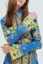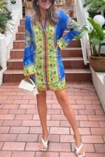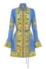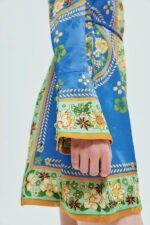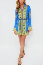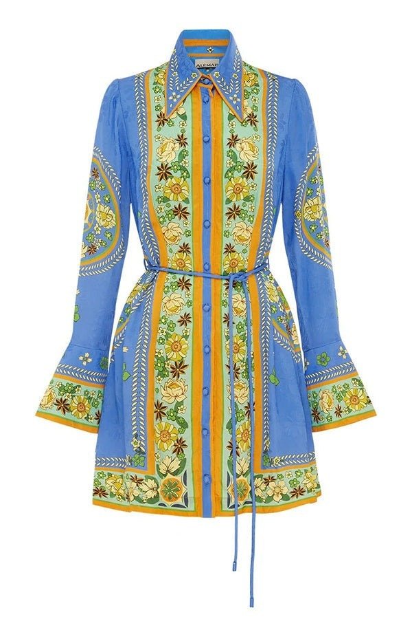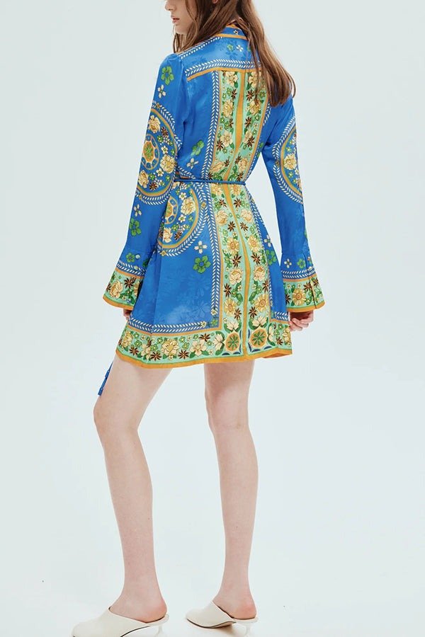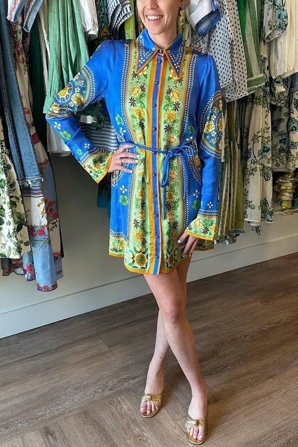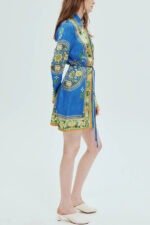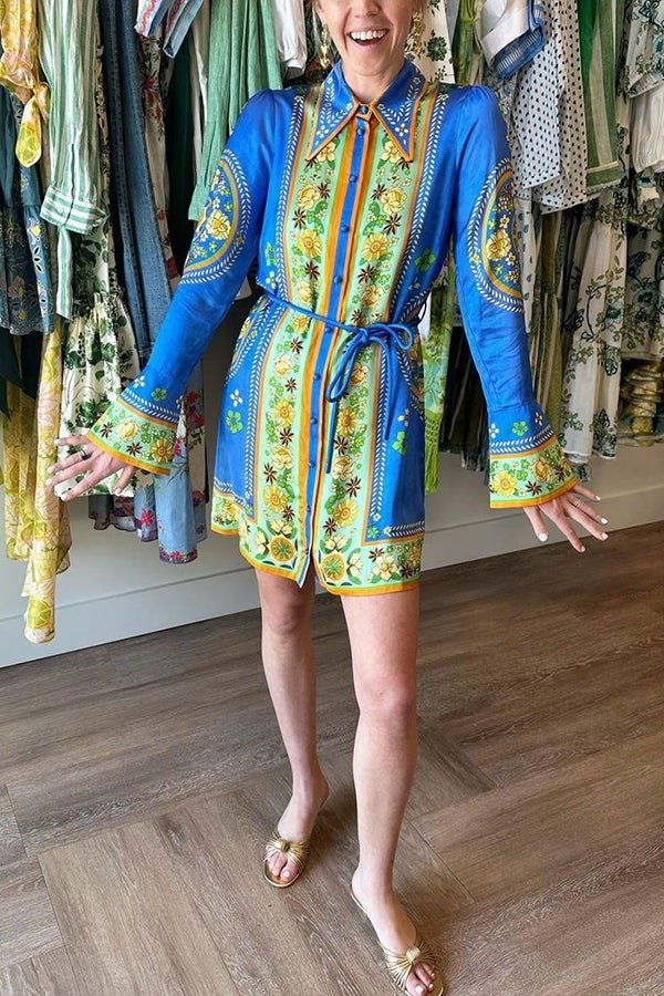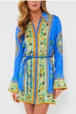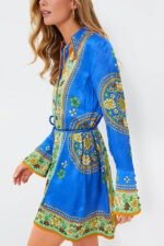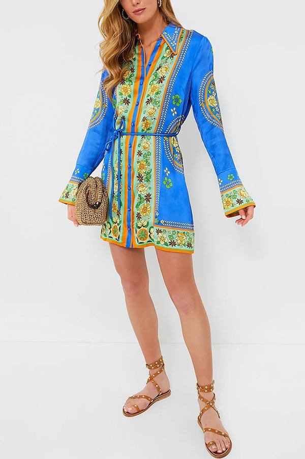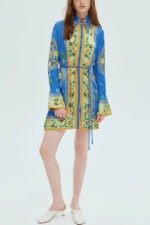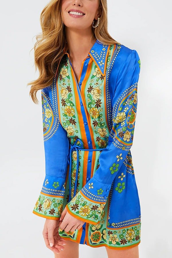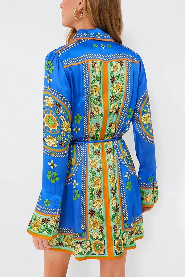 Katia Satin Unique Print Shaped Collar Tie-up Waist Shirt Mini Dress