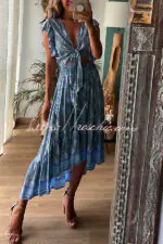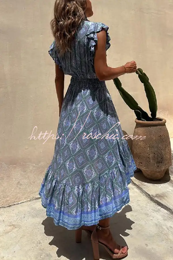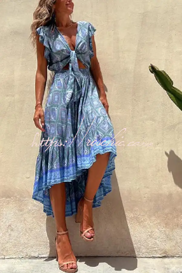 Libby Hippie Boho Printed Tie Front Ruffle Sleeve Smocked Waist Midi Dress