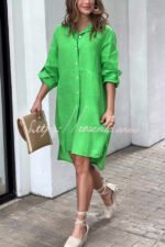 Linen Blend Solid Long Sleeve Button-Down Shirt Style Mini Dress