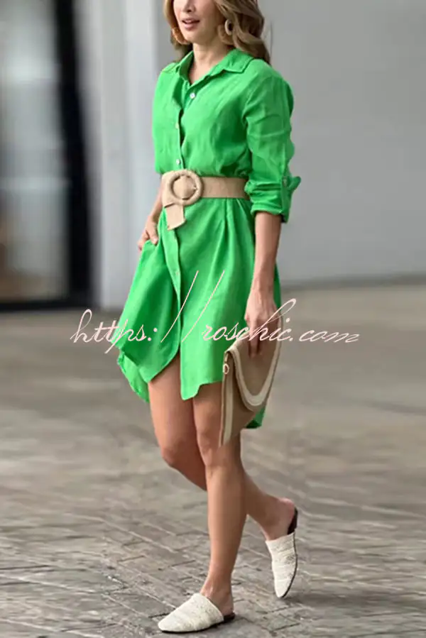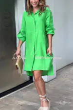 Linen Blend Solid Long Sleeve Button-Down Shirt Style Mini Dress
