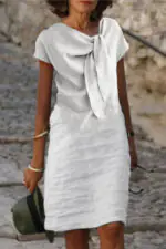 Linen Blend Solid Short-sleeved Adjustable Tie-neck Mini Dress