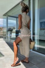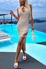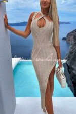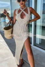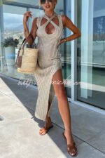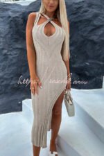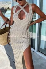 Malibu Scrunch Knit Cross Neckline Slit Midi Dress
