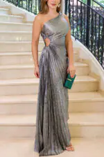 Midnight Kiss Metallic Fabric One Shoulder Cutout Pleated Maxi Dress