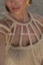 - Modern and sophisticated – an absolute stunner of a column gown! Symmetrically placed handwoven detailing creates a soft cage-like effect at the neckline with beautifully draped braids at the shoulders. Follow the braids to the back. to reveal an interconnected arrangement of intricate lines. This long. lean silhouette can be worn belted for a more conservative drape or without ties to create an eye-catching plunge back.