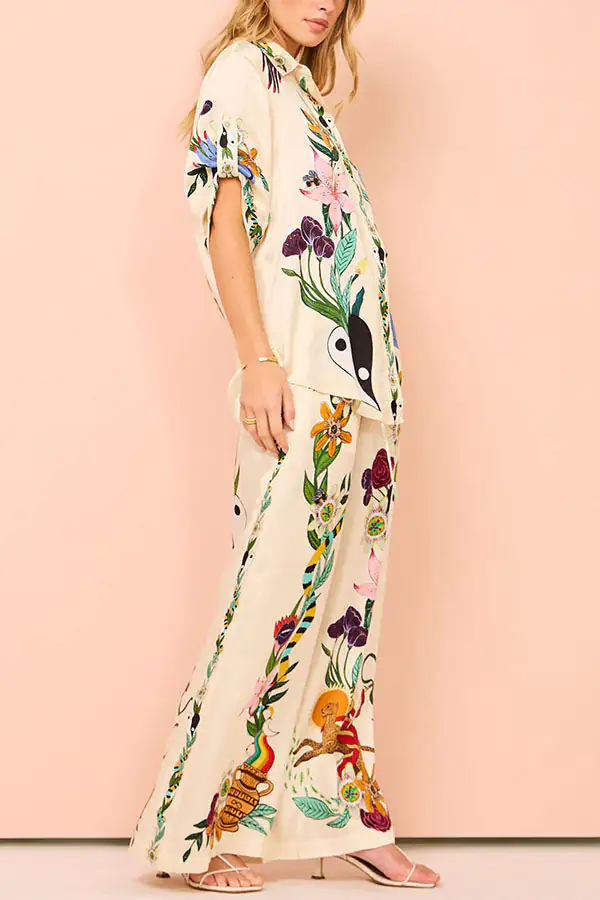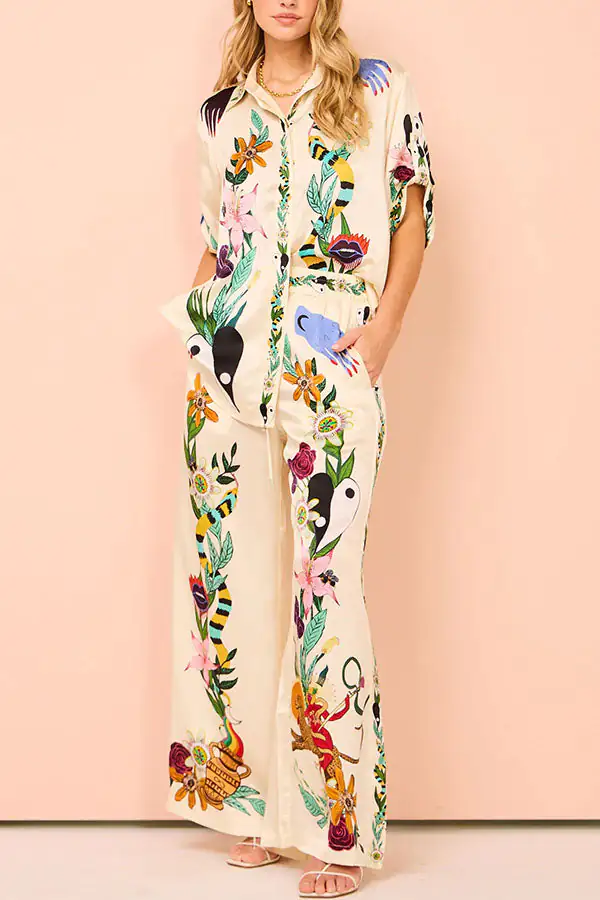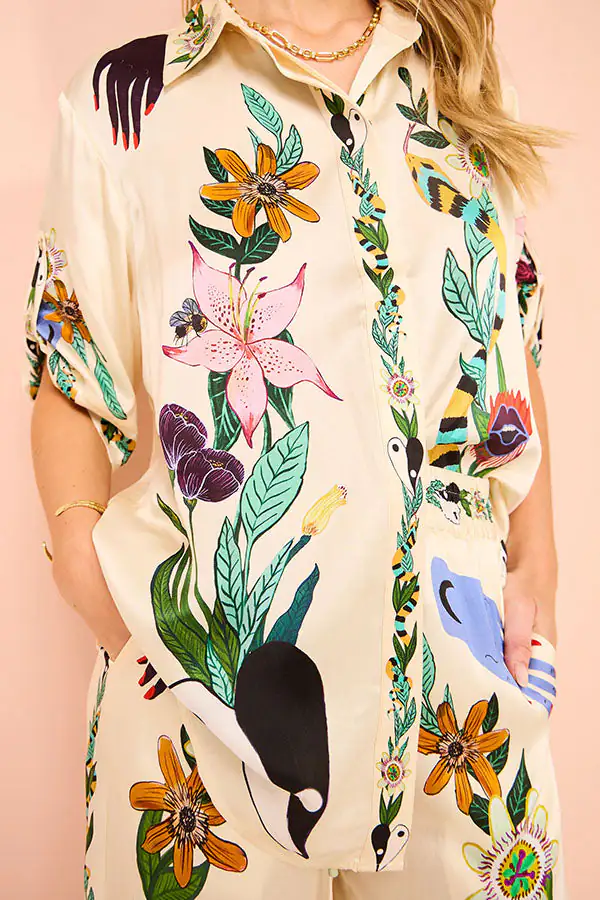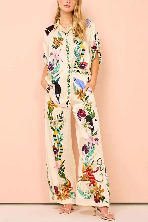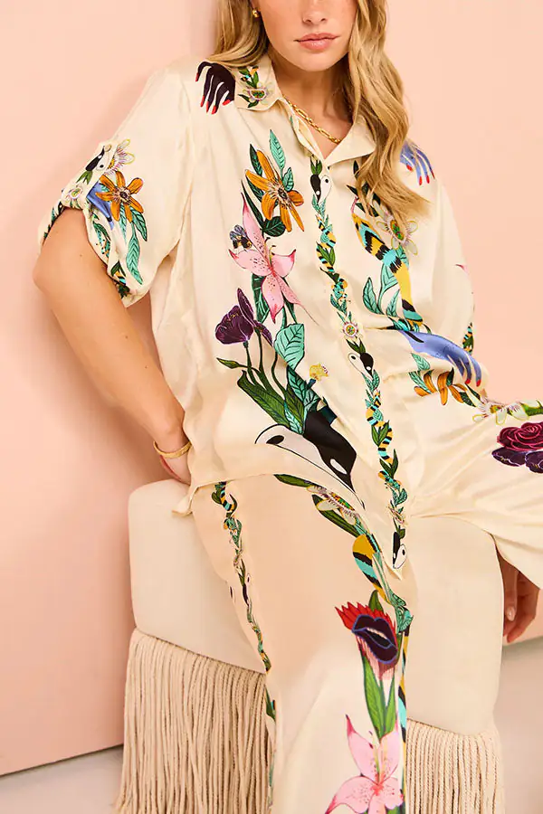 Modern Sophisticated Feel Satin Unique Print Button Down Oversized Blouse