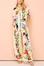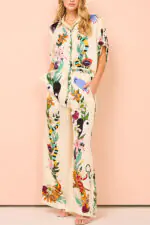 Elouise Linen Blend Unique Print Button Puff Sleeves Tie-up Pocketed Romper