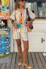 Nikita Linen Blend Striped Knotted Puff Sleeve Top and Elastic Waist Pocket Shorts Set