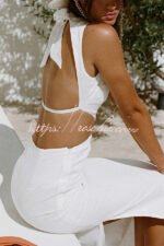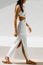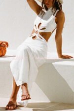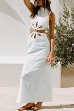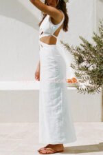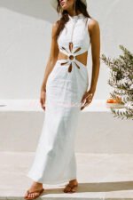 Omnia Linen Blend Ring and Flower Cutout Detail Back Tie-up Maxi Dress