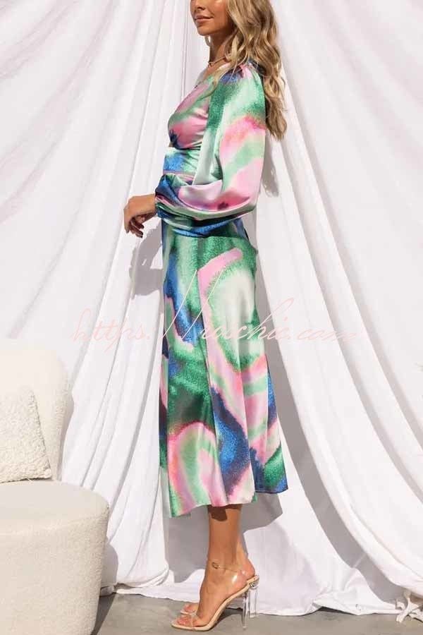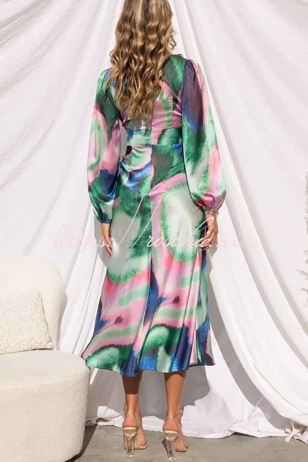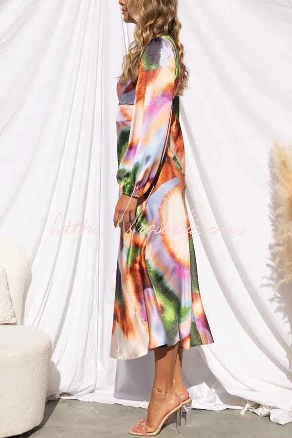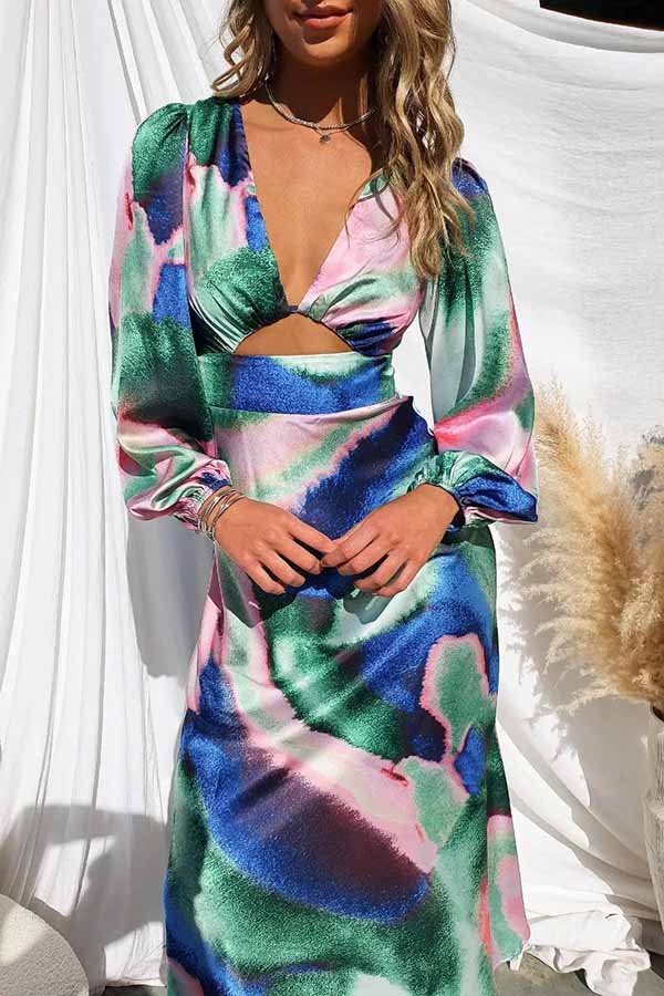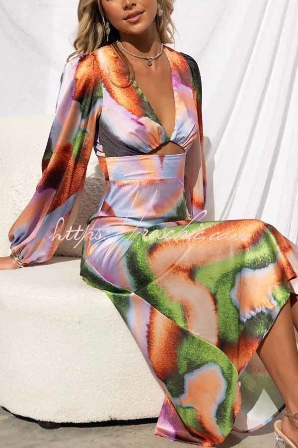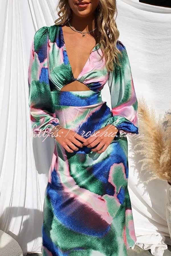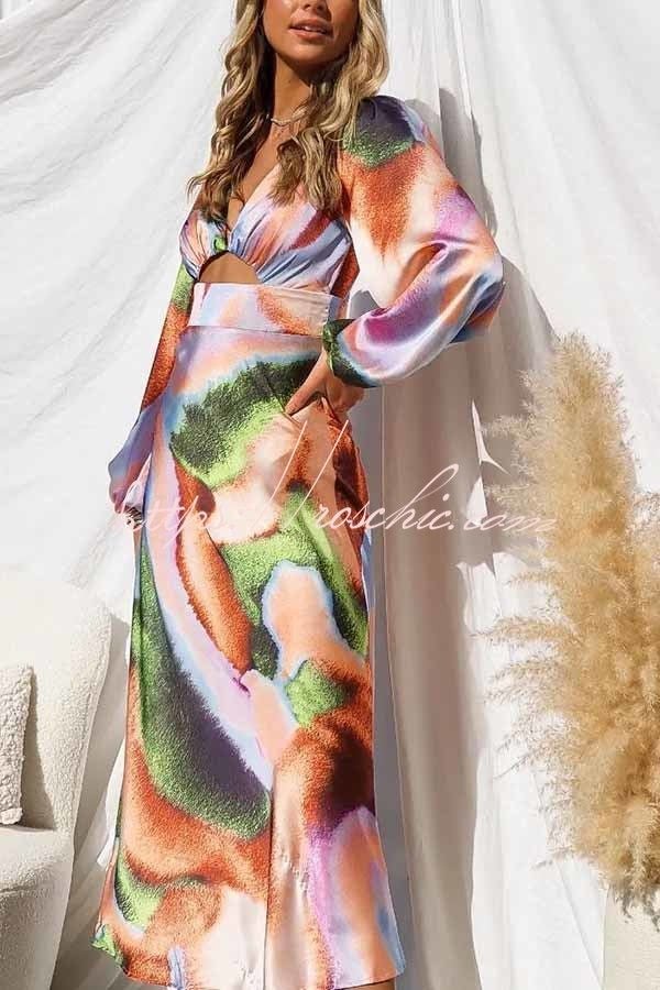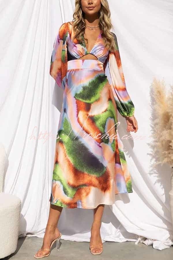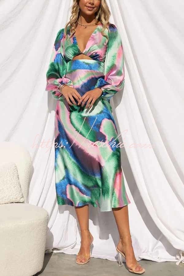 Own The Evening Satin Neon Print Cutout Midi Dress