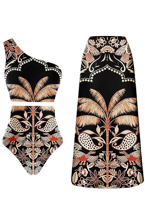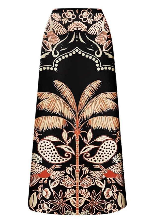 Palm Tree Bird Print Color Block High Waist Bikini And Skirt