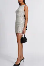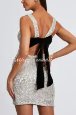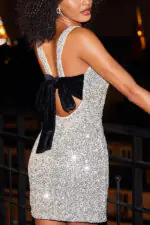 - This mini dress features a round neck. sleeveless design. and a bodycon fit. adorned with sequins and a bow detail at the back. perfect for evening events and parties.Our distinctive clothing will add instant style to your wardrobe.